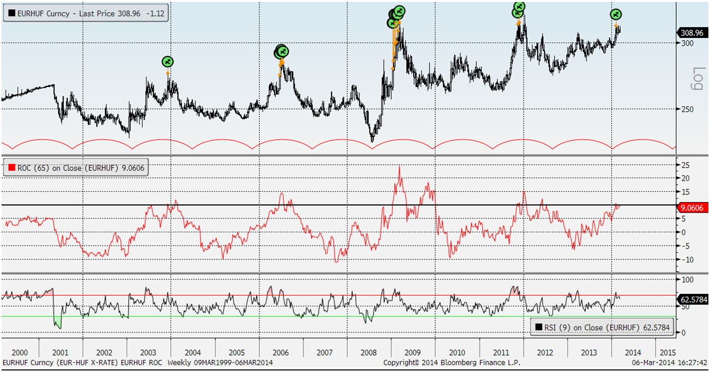 A dicembre avevamo previsto un minimo ciclico su EurHuf consigliando un alleggerimento o quantomeno evitare l’ingresso sul Fiorino in quel momento considerato piuttosto fragile. In quel momento eravamo a 295 e possiamo dire che l’obiettivo è stato raggiunto con EurHuf salito fino a 315. Consapevoli che il prossimo minimo ciclico si verificherà nel 2015 adesso si apre una prospettiva molto interessante dal lato short EurHuf. Abbiamo fatto un test provando a vedere dove si trovava EurHuf nel momento in cui il cambio risultava parecchio stressato come ora, ovvero con Roc a 65 settimane sopra il +10% e Rsi in ipercomprato. I flag verdi mostrano dove si trovava EurHuf in quel momento…ai lettori la deduzione logica.