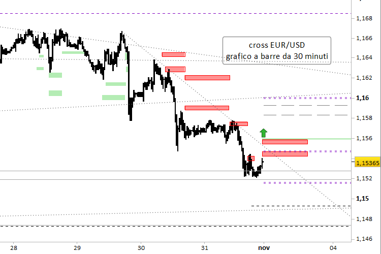 Per quanto riguarda lo scenario di brevissimo periodo, sul grafico a barre da 30 minuti individuiamo per la sessione di lunedì due resistenze principali a 1.1545 e 1.1560, che mantengono attiva la pressione ribassista in vigore dai massimi relativi del 28 ottobre. La tenuta di queste resistenze potrebbe favorire una nuova violazione dell’area di supporto situata tra 1.1515/1.1527, a favore di un ultimo colpo di coda ribassista con proiezioni a 1.1495 e 1.1475.