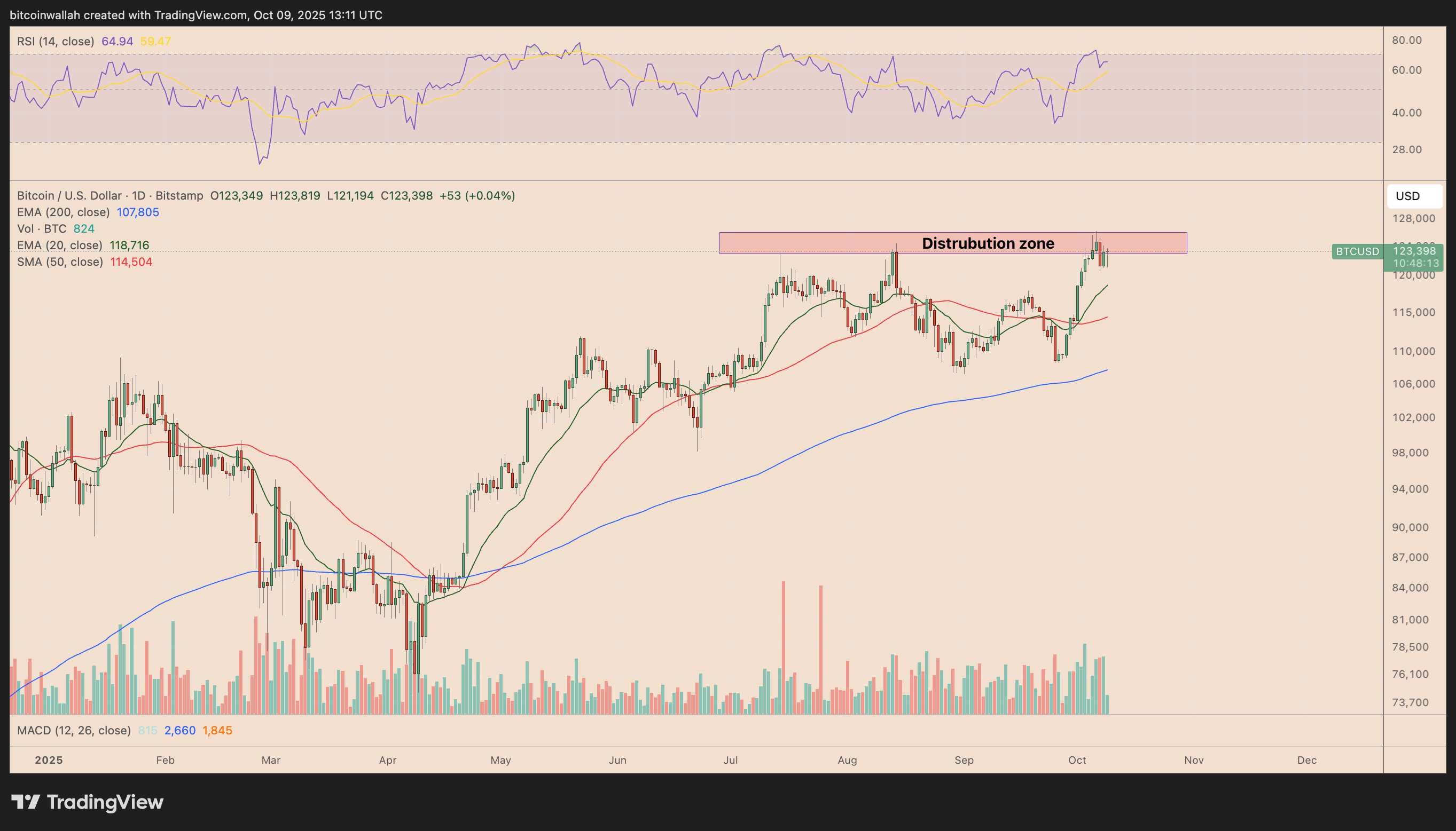 I trader osservano attentamente questa fascia, poiché un mancato superamento potrebbe confermare la formazione di un massimo locale, favorendo un ritracciamento più profondo verso la media mobile esponenziale a 50 giorni (intorno a 118.700 dollari).