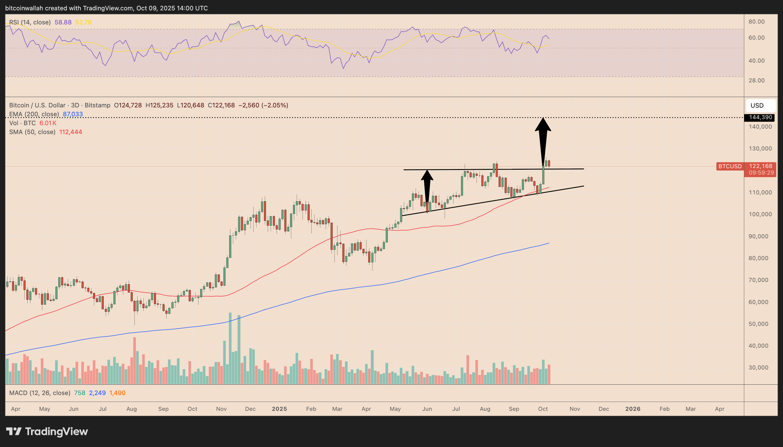 Nel grafico a tre giorni, BTC sembra stia testando nuovamente la linea di tendenza superiore di un triangolo ascendente lungo un anno, un pattern generalmente considerato un segnale di continuazione in mercati rialzisti.
