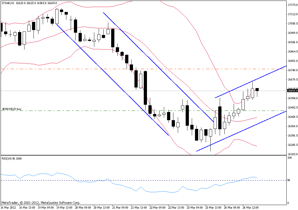 Il FTSE/MIB ha raggiunto il nostro livello di entrata e il trend intraday è ben direzionato verso 16750 dove attualmente passa la media centrale delle bande di bollinger.