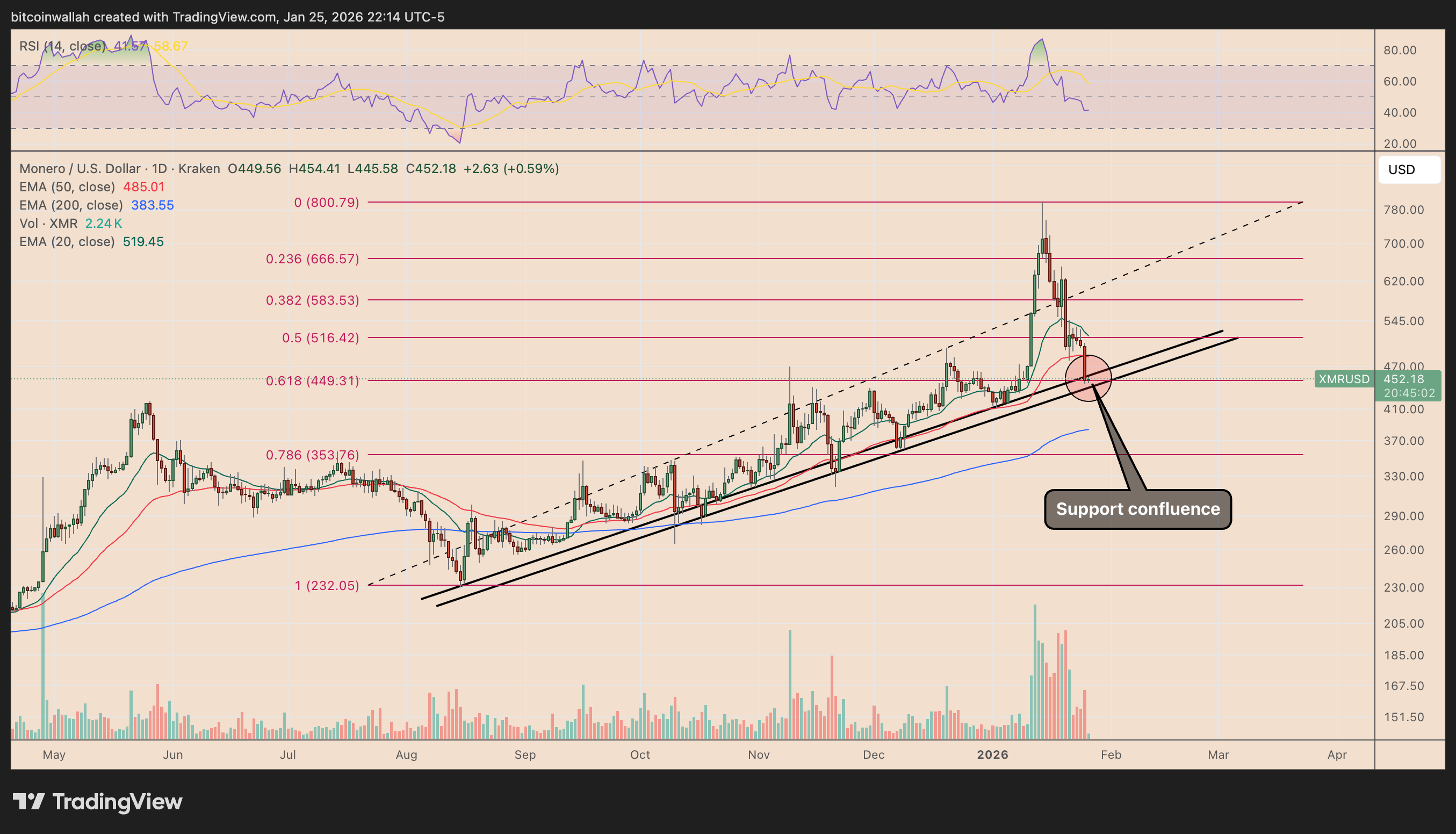 Se i compratori lo difendono, XMR può rimbalzare verso $515–$590, dove si concentrano le bande Fib 0,5/0,382 e le precedenti aree di stallo. Ma se $450 cede, il downside si aprirebbe verso la EMA a 200 giorni vicino a ~$385, e poi verso il Fib 0,786 vicino a ~$350.