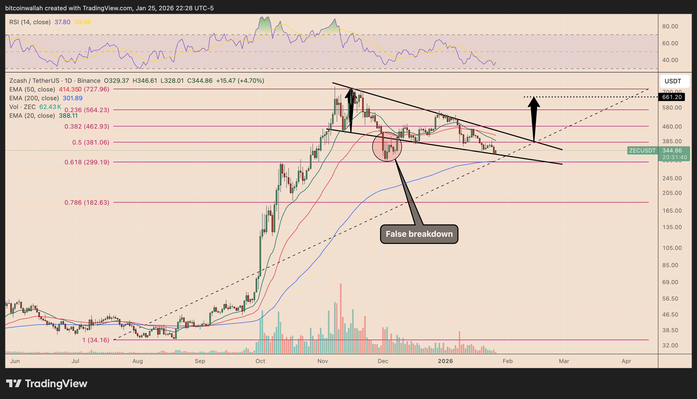 ZEC sta tenendo un cuneo discendente vicino a supporti chiave, migliorando le probabilità di rimbalzo come nell'ottobre 2025.
