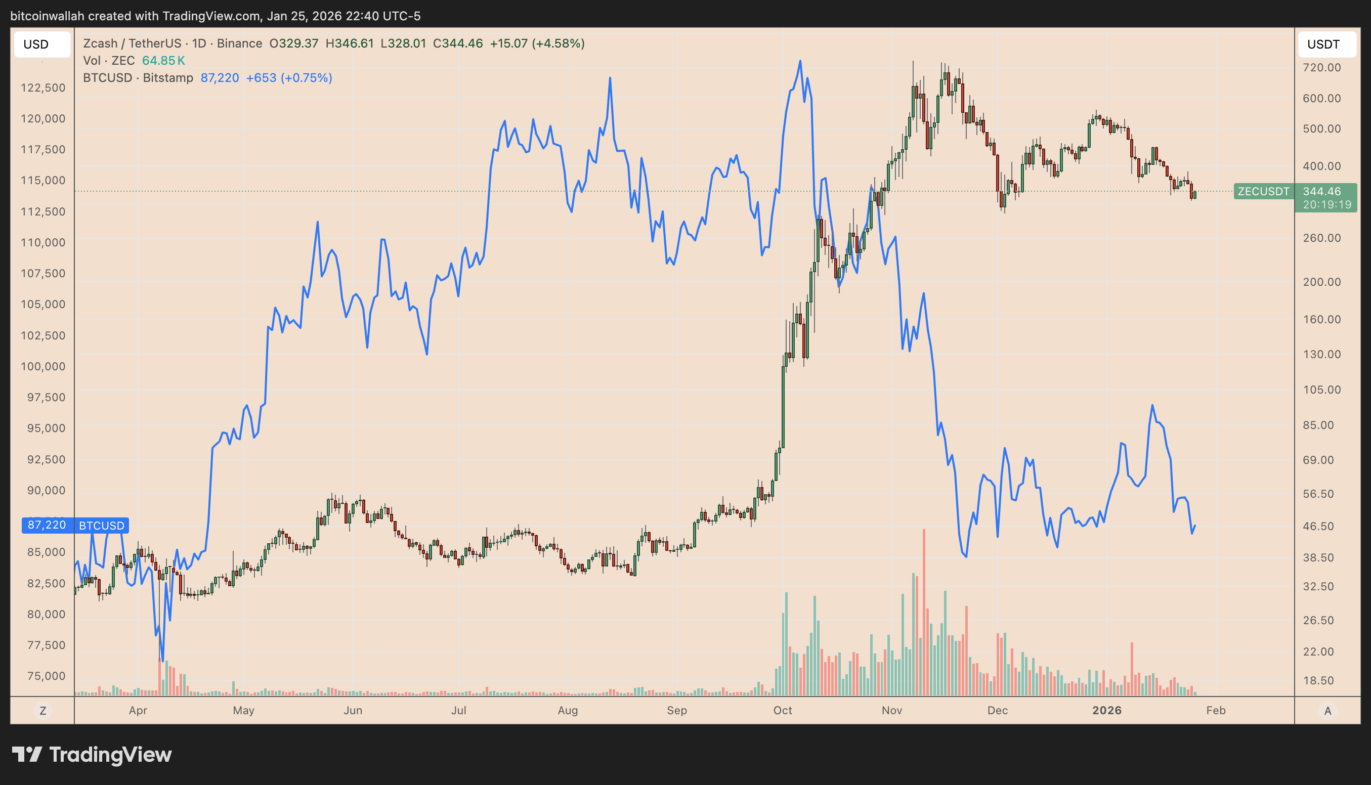 Zcash ha fatto esattamente questo lo scorso anno: Bitcoin è sceso, ZEC è rimbalzato e i trader lo hanno trattato come un outlier di forza relativa mentre l’appetito per il rischio appariva fragile.