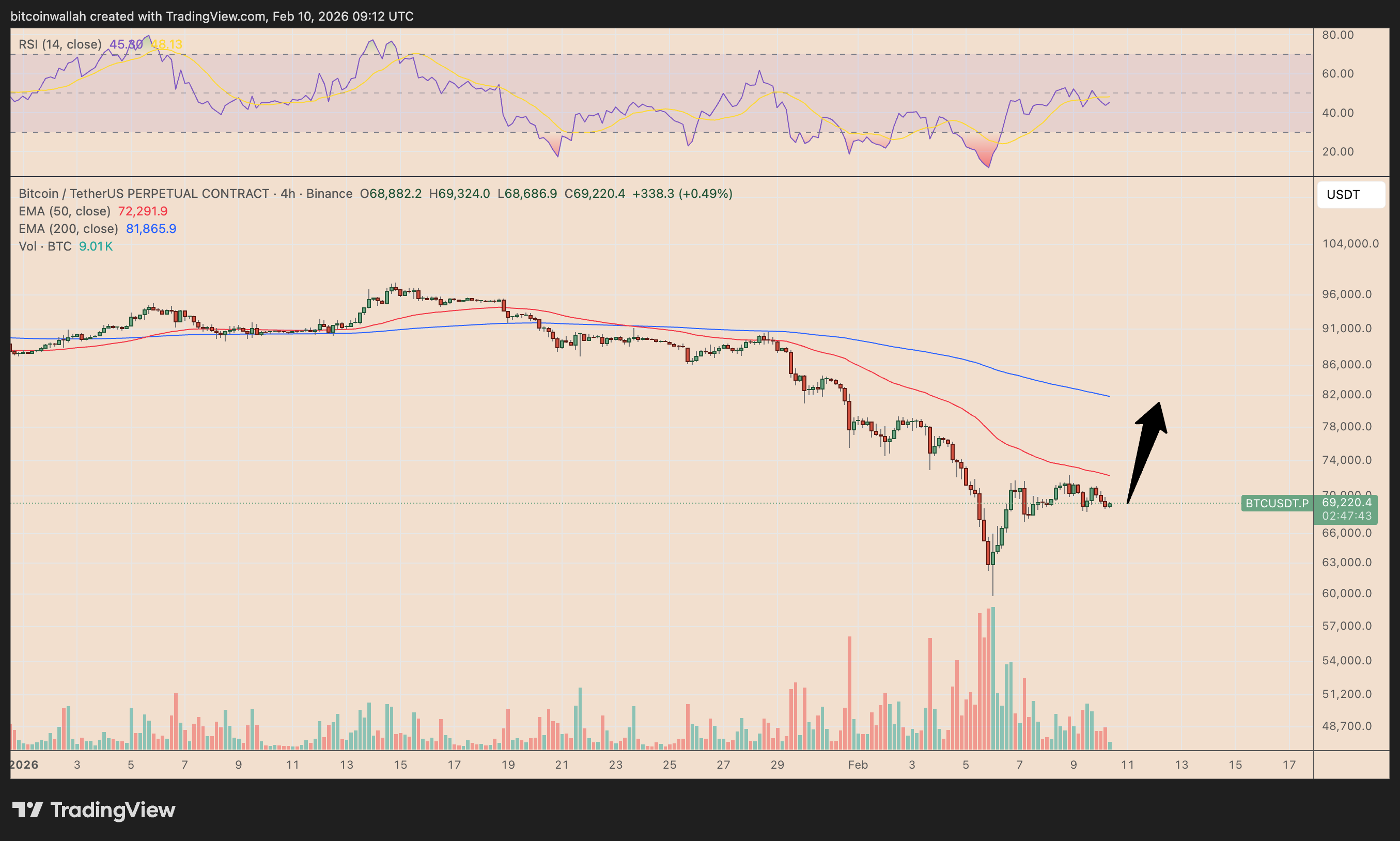 BTC è prima sceso nei bassi $60.000 in quello che appariva come capitolazione, con volumi elevati che suggerivano vendite forzate e liberazione della leva. Poi è rimbalzato rapidamente verso l’area dei $69.000–$70.000, una mossa probabilmente derivante più dalla copertura degli short che da nuova domanda spot.