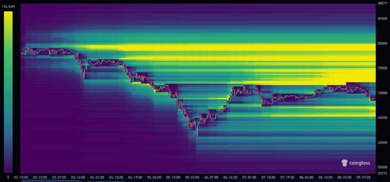 Ma se il prezzo mantiene la metà della fascia dei $60.000 e torna a superare i $72.000, la banda di liquidità più ampia tra $72.000 e $80.000 potrebbe tirare BTC verso l’alto e impostare un retest a $80.000.