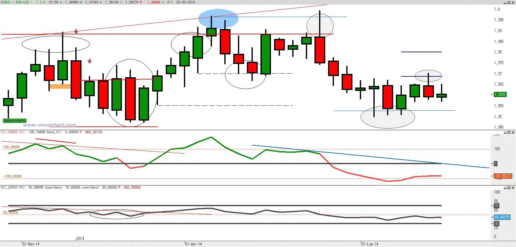 Condizione generale di periodo. Rimane in trading range la nostra valuta come, ormai, da diverse settimane; la volatilità rimane limitata e positività e negatività relativa si alternano con una certa consuetudine dal momento in cui è stato segnato il minimo di periodo in area 1,35 punti; proprio tra 1,35 e 1,37 punti, infine, si sta stabilizzando la situazione generale che vede gli operatori di medio termine fuori dal mercato e gli operatori di brevissimo termine attivi su grafici giornalieri e orari e che determinano, dunque, rialzi e ribassi di ben poca consistenza.