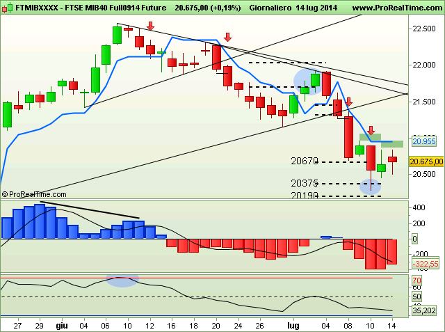 L’area tra 20250 e 20950 rappresenta il range di contenimento valido per il brevissimo termine; un’eventuale rottura di uno dei due livelli potrebbe ridare direzionalità al mercato con obiettivo rialzista a 21400/21500 o ribassista a 19700/19800 punti circa; cautelativamente, il break rialzista dovrebbe essere confermato su base daily.