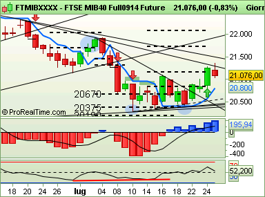 L’area compresa tra 20350 e 21100 è stata rotta al rialzo. In termini speculativi, come anticipato, l’eventuale rottura rialzista avrebbe potuto portare immediatamente a 21200/21300, situazione realizzatasi puntualmente; in un’ottica di maggior respiro, invece, l’eventuale continuazione potrebbe portare le quotazioni sul secondo target, obiettivo naturale minimo, posizionato tra 21600 e 21700 punti circa. In aggiunta: l’ultima seduta ha confermato il break senza mantenerlo in close (chiusura inferiore a 21240); ne consegue che, per reiterare la conferma di possibili nuovi rialzi, la prossima seduta dovrà vedere prezzi intraday almeno oltre i 21300 punti. Possibile primo supporto in area 20700 punti circa.