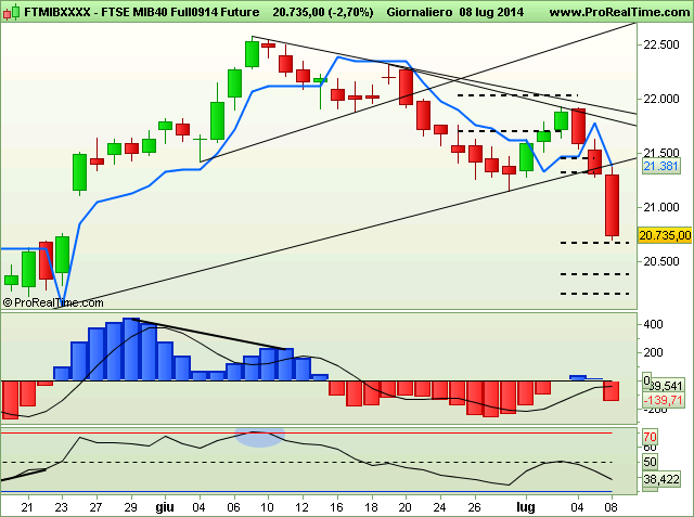 Volumi: il sistema è entrato short sotto 21220/21230 con stop da valutare in base all’apertura della prossima seduta. Per un’operatività più speculativa, i due obiettivi validi potrebbero essere 20730 e 20150/20200 punti (l’apertura sopra o sotto il primo dei due livelli potrebbe indirizzare meglio la scelta).