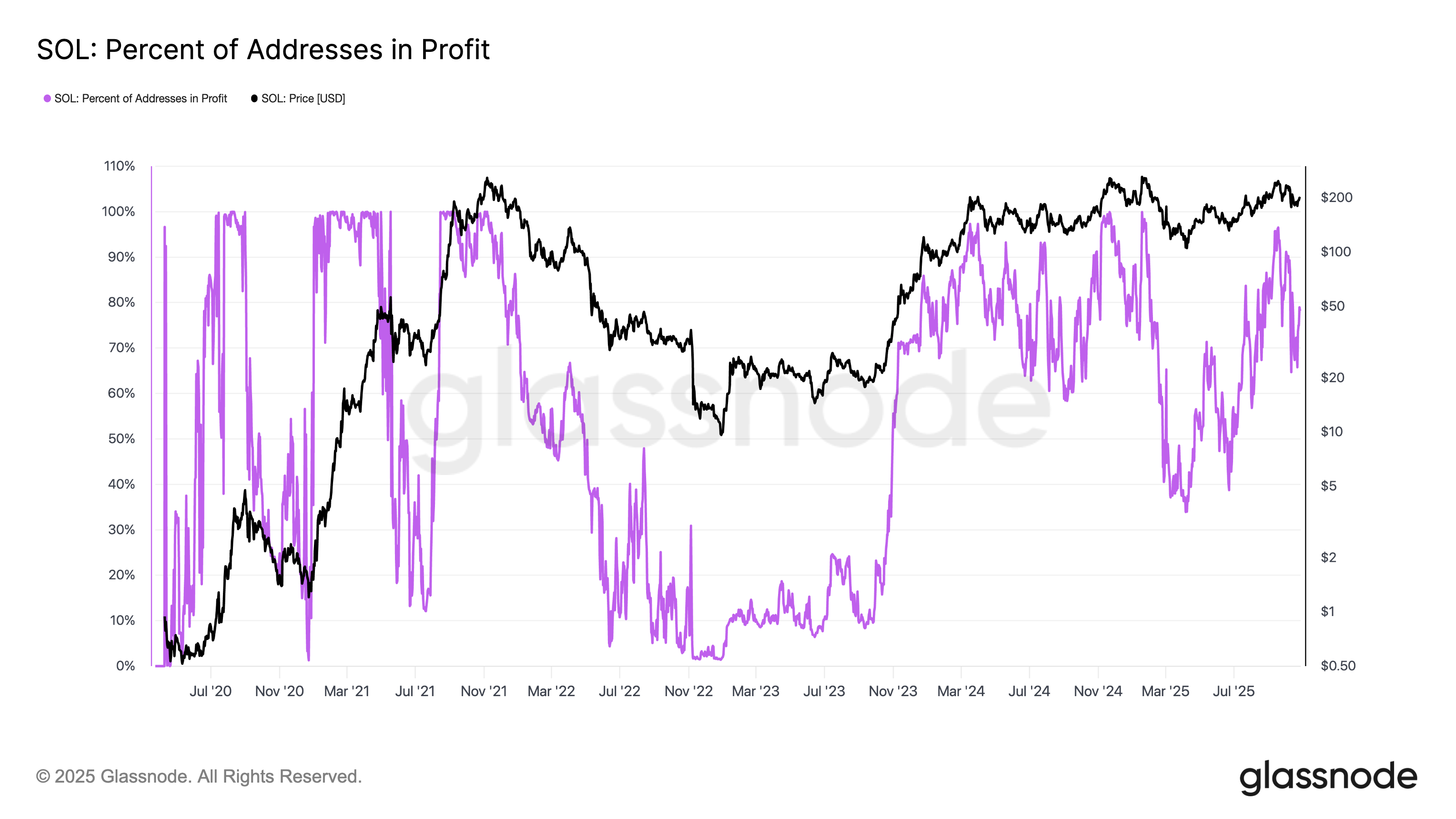 I dati on-chain di Glassnode mostrano che quasi il 75% di tutti gli indirizzi Solana è in profitto, a testimonianza della forte fiducia dei detentori e di una struttura di mercato sana.
