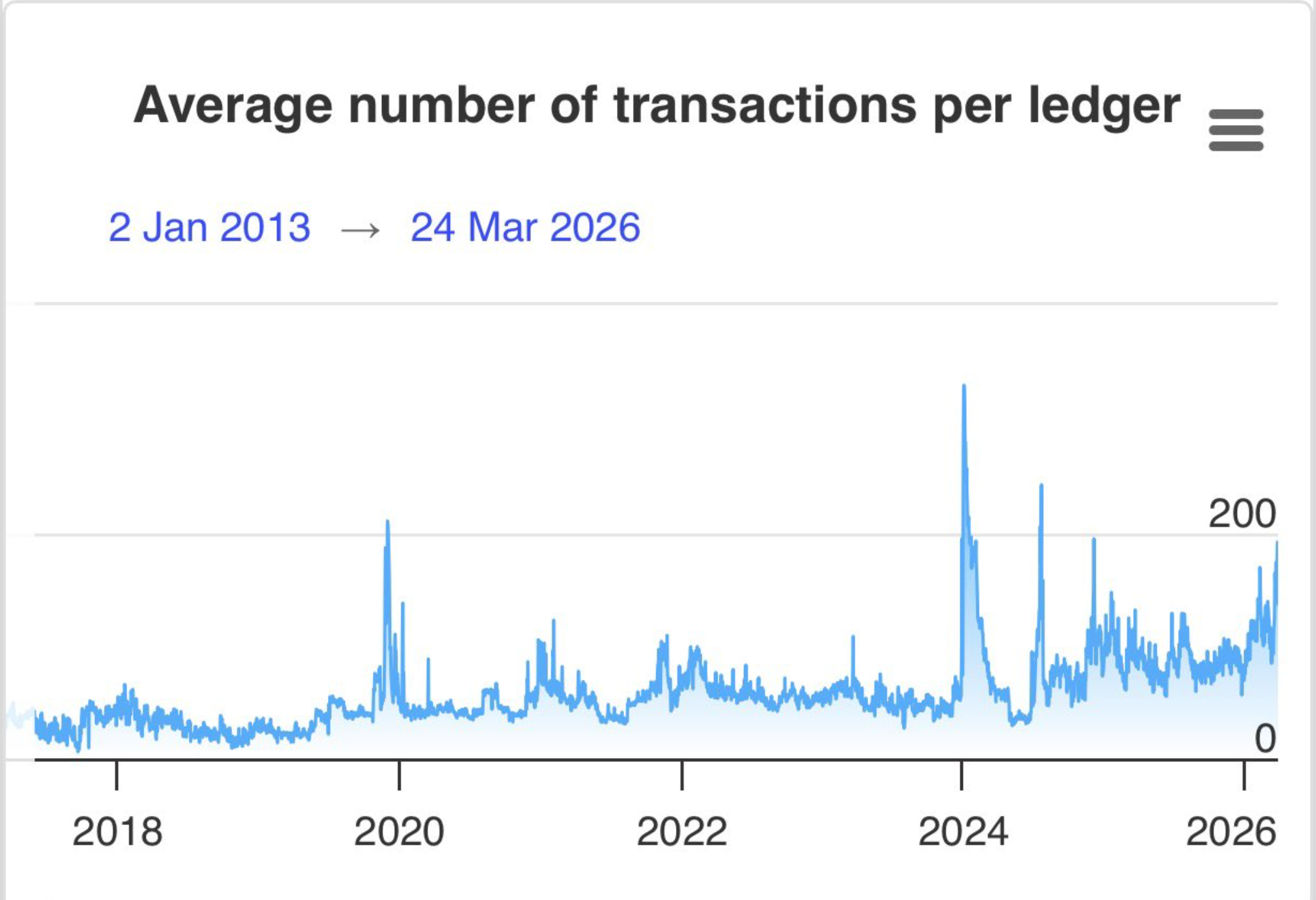 L’attività di rete è aumentata verso la fine di marzo 2026, con un ledger che il 23 marzo ha raggiunto circa 190 transazioni e livelli sostenuti prossimi a 200 transazioni per ledger, un picco raro.