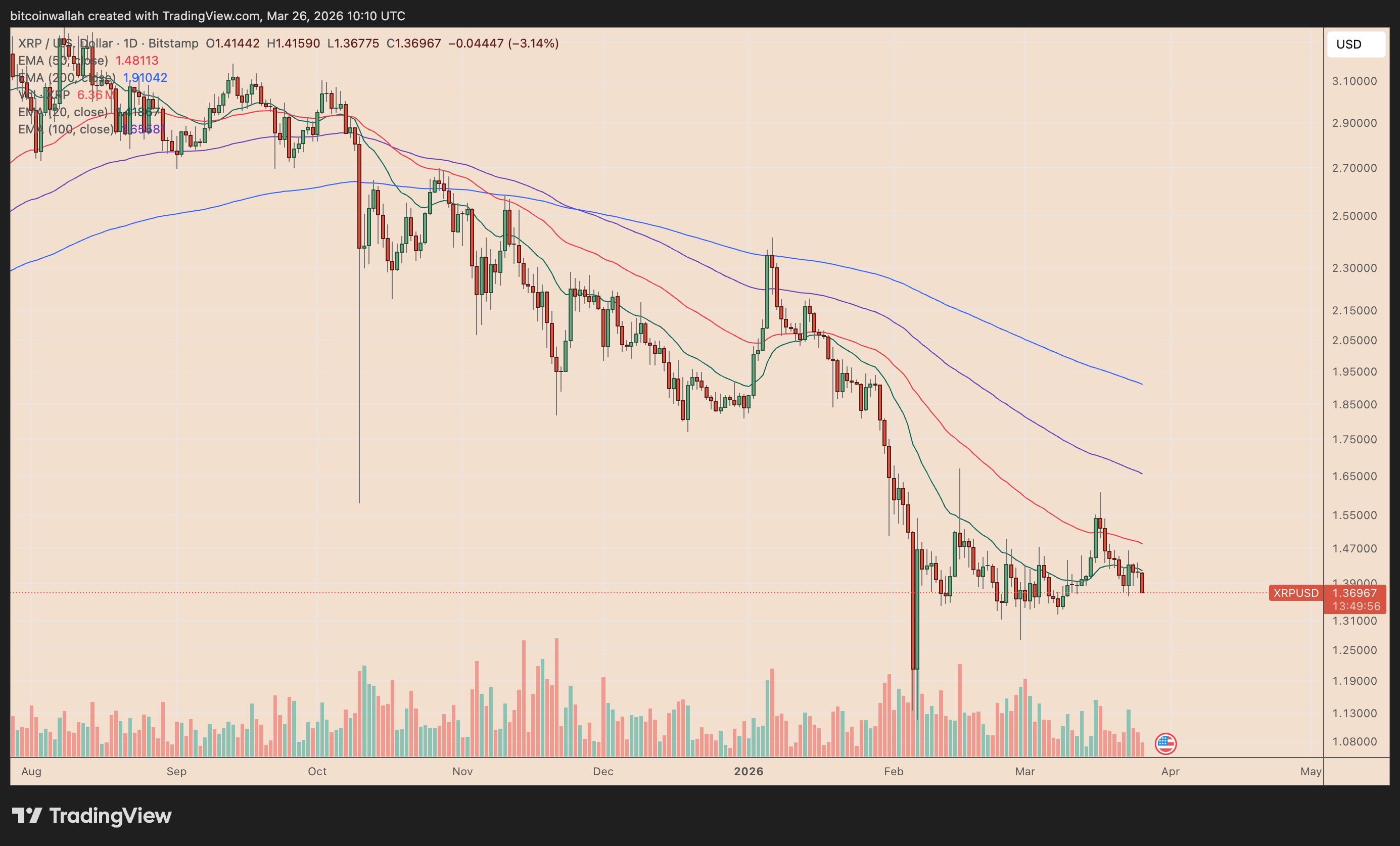 XRP (XRP) ha registrato un calata il 26 marzo 2026, scivolando di circa il 3% nelle ultime 24 ore e attestandosi intorno a $1,37–$1,38 mentre i trader bilanciavano la debolezza più ampia del mercato crypto con una nuova ondata di notizie specifiche su XRP.