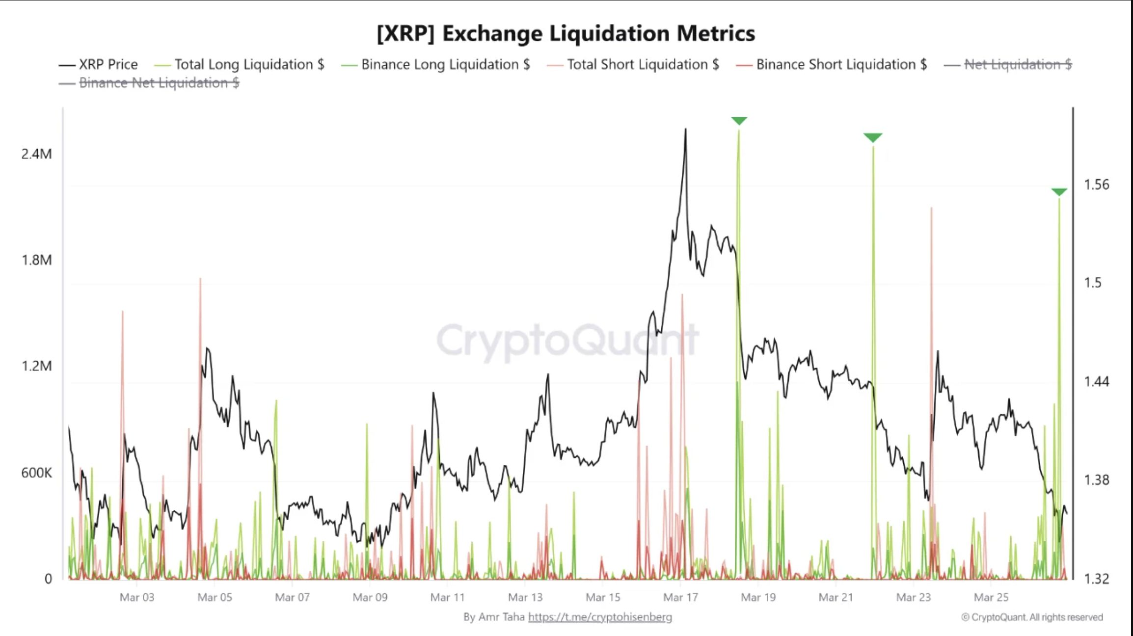 Tuttavia, il posizionamento resta fragile. Il mercato ha registrato ripetuti picchi di liquidazioni long. Il 18 marzo è stato superiore a 2,5 milioni di USD; il 21 e il 25 marzo era intorno a 2,45 milioni e 2,15 milioni di USD, rispettivamente.