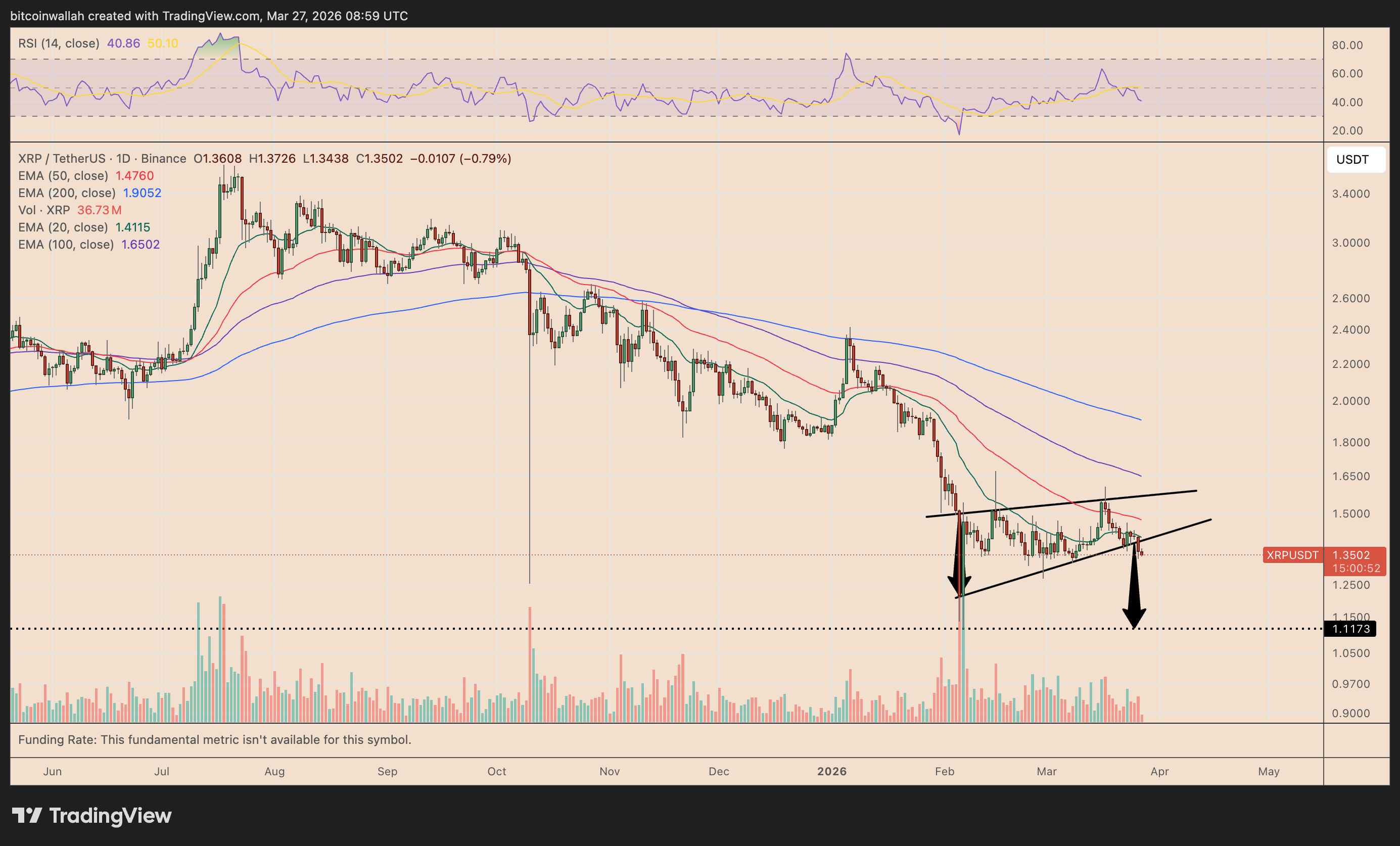 XRP sembra essere in fase di rottura da un pattern a cuneo ascendente sul grafico giornaliero, una struttura tipicamente associata a inversioni ribassiste.