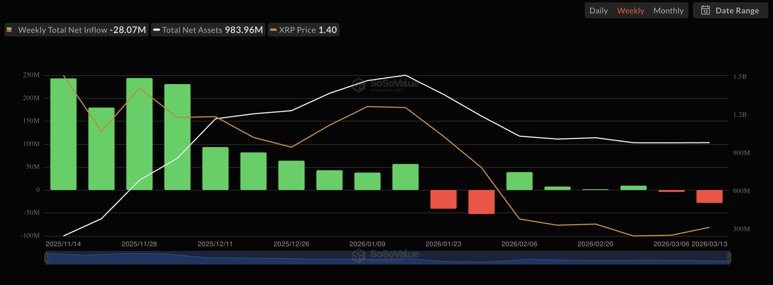 Gli ETF su XRP hanno accumulato oltre 1,4 miliardi di dollari di flussi in entrata totali dalla loro introduzione nel novembre 2025, evidenziando un interesse sostenuto a lungo termine per l’asset.