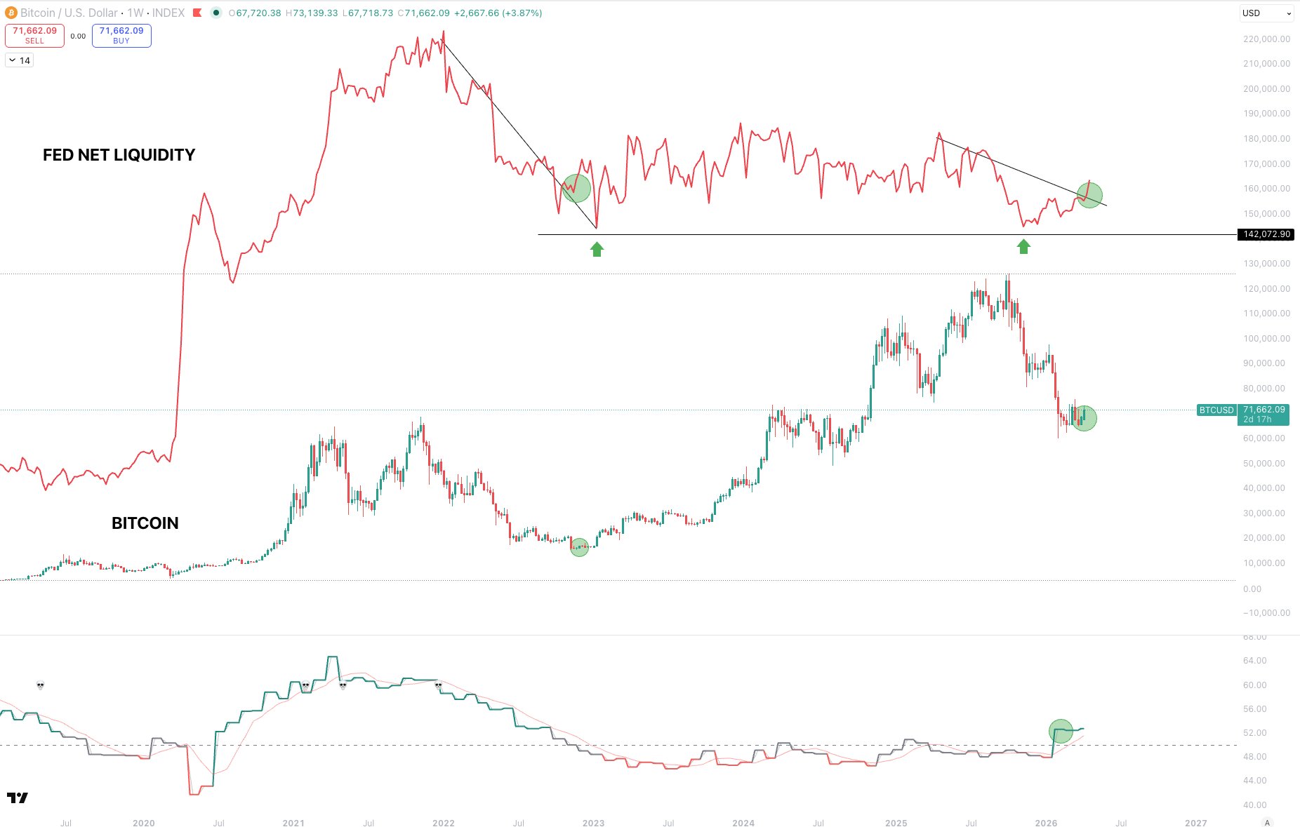 Gli osservatori di mercato notano che la liquidità netta della Fed ha superato una tendenza al ribasso pluriennale dopo essere rimasta laterale per circa quattro anni, delineando una configurazione simile alla fine del 2022, quando il miglioramento delle condizioni di liquidità coincise con un importante minimo del settore crypto.