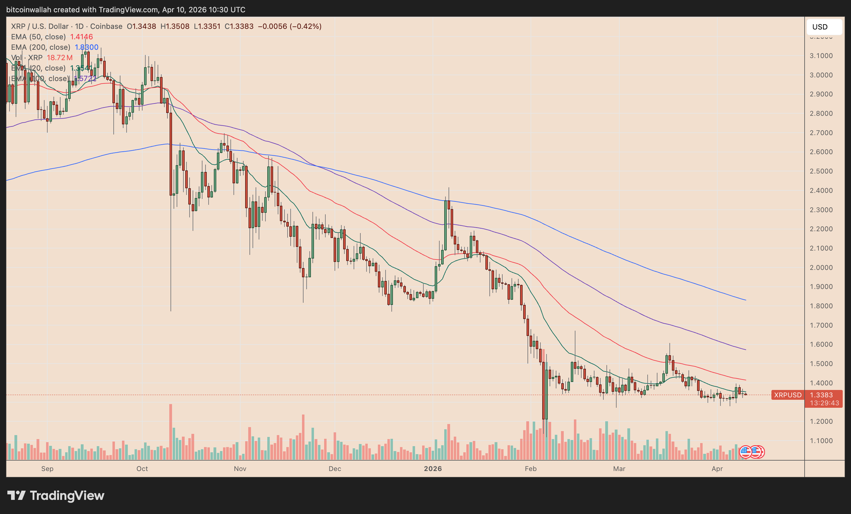 Il cambio XRP/USD oscillava venerdì tra guadagni e perdite, pur restando in rialzo del 4,35% rispetto al minimo settimanale di 1,29 USD.