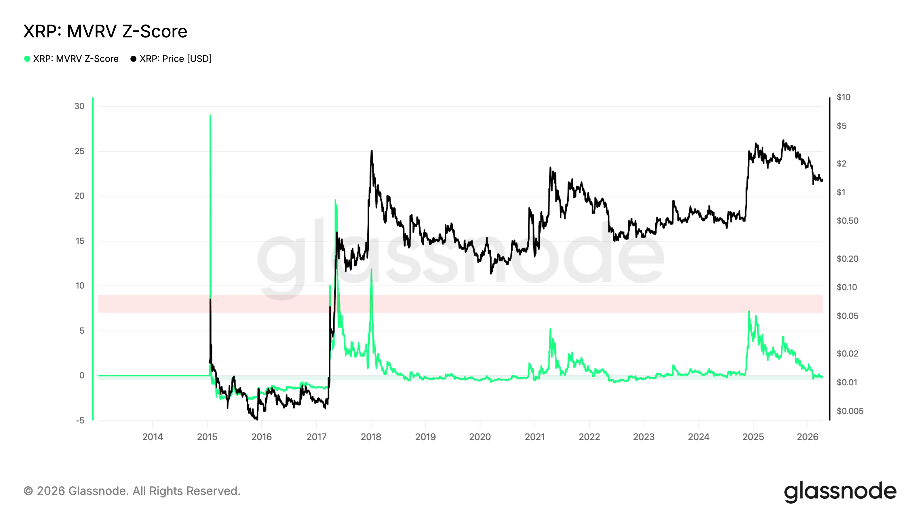 Lo Z-score MVRV di XRP si aggira vicino allo zero, un livello che storicamente corrisponde a zone di accumulo e a minimi di mercato.