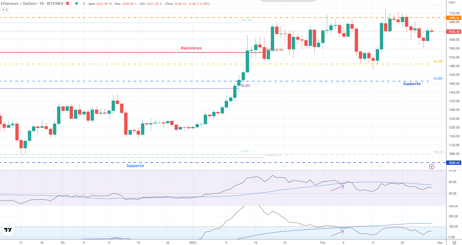 Scendendo su un grafico daily, vediamo che Ethereum si sta fermando sotto la resitenza a 1700$. Questo livello lo segnalavamo già 15 giorni fa, Previsioni Ethereum: in Rimbalzo Deve Rompere i 1700$.