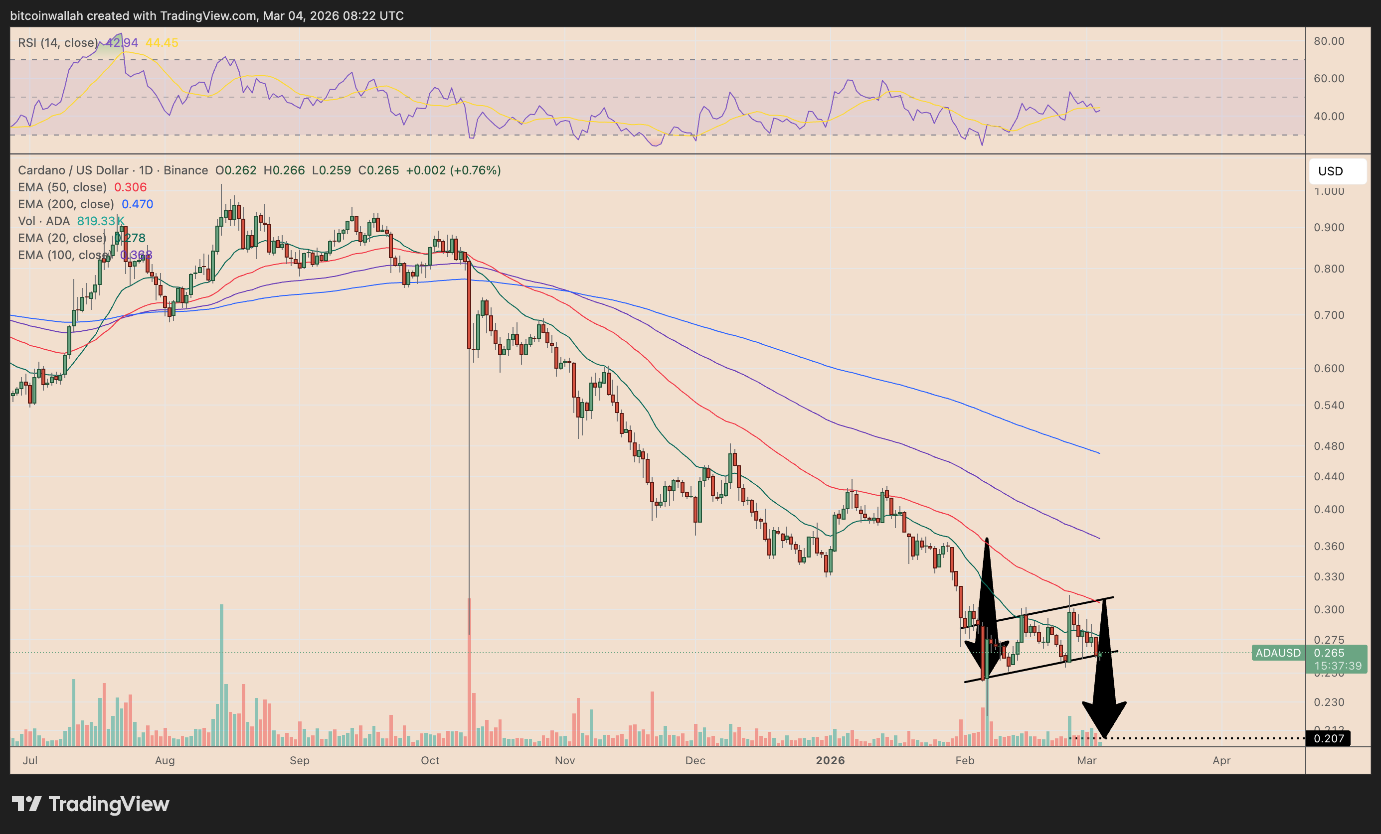 ADA sta formando una bandiera ribassista sul grafico giornaliero dopo la forte svendita di febbraio, spesso una pausa prima che il trend discendente riprenda.
