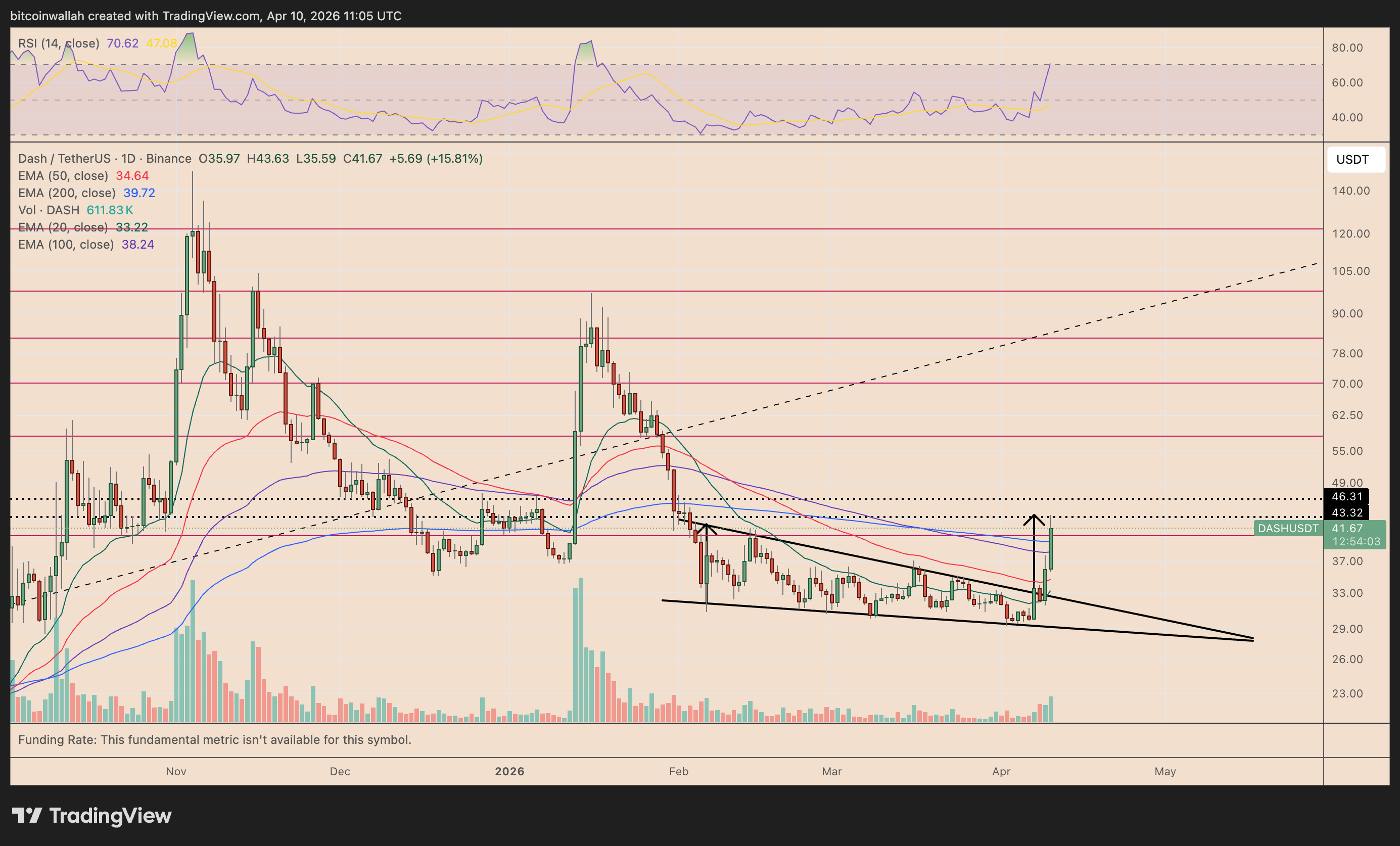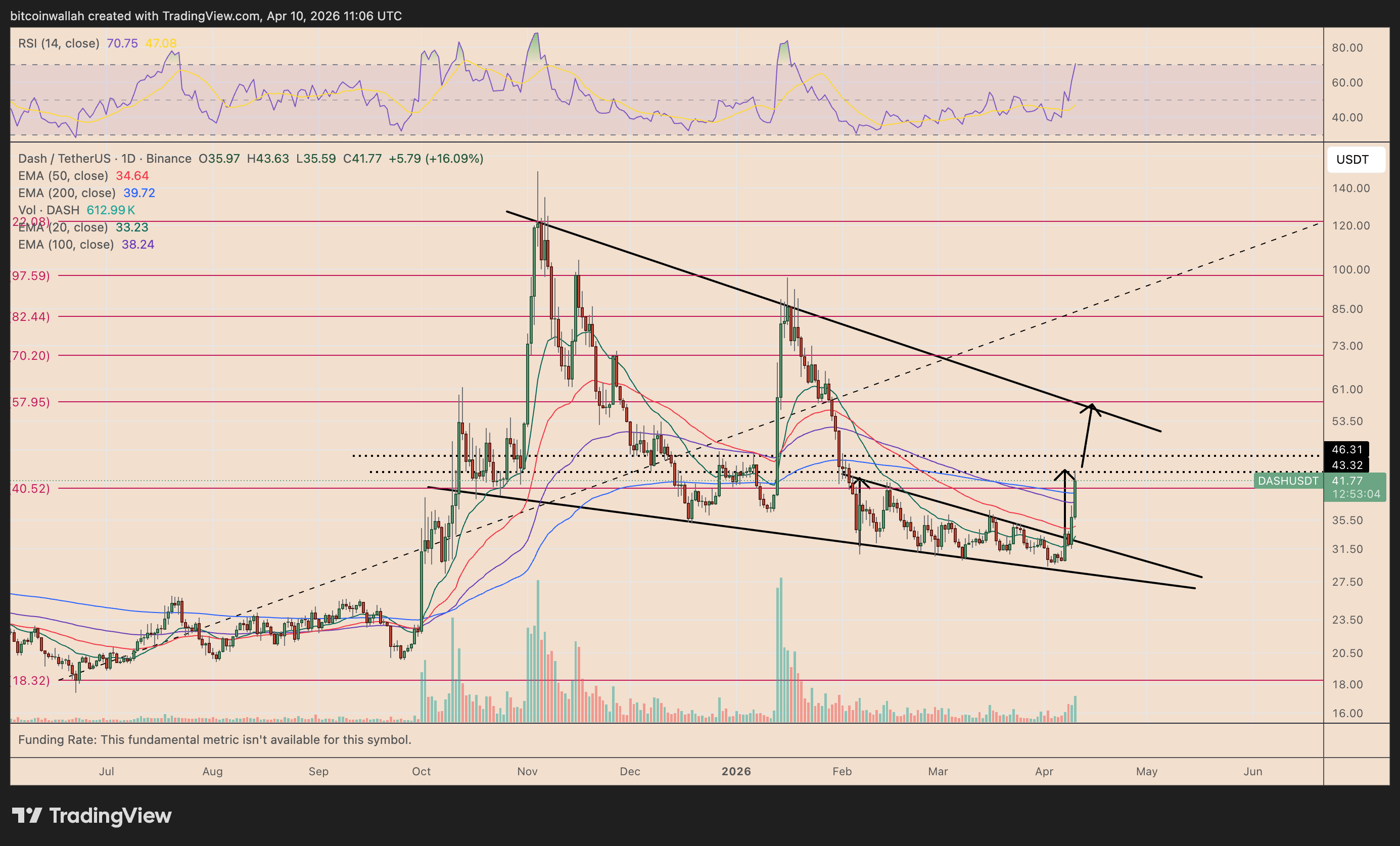 L’ultimo rally di Dash segue un breakout confermato da un cuneo discendente a breve termine, una struttura di inversione rialzista che solitamente si risolve con un deciso movimento al rialzo.