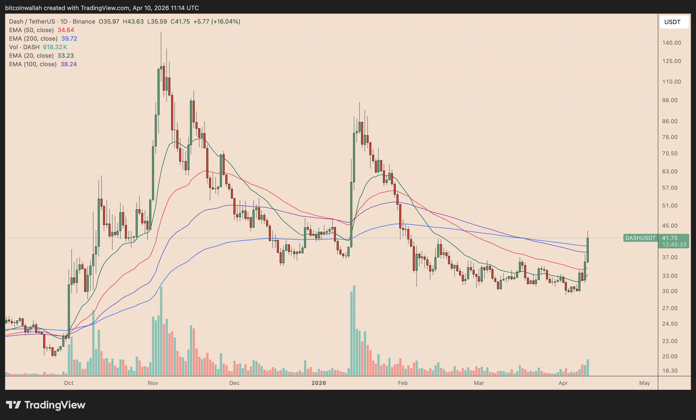 Dash (DASH) è diventato uno dei migliori performer del mercato crypto, mentre l’allentamento delle tensioni geopolitiche dopo il cessate il fuoco tra Stati Uniti e Iran ha rilanciato la domanda di asset più rischiosi.