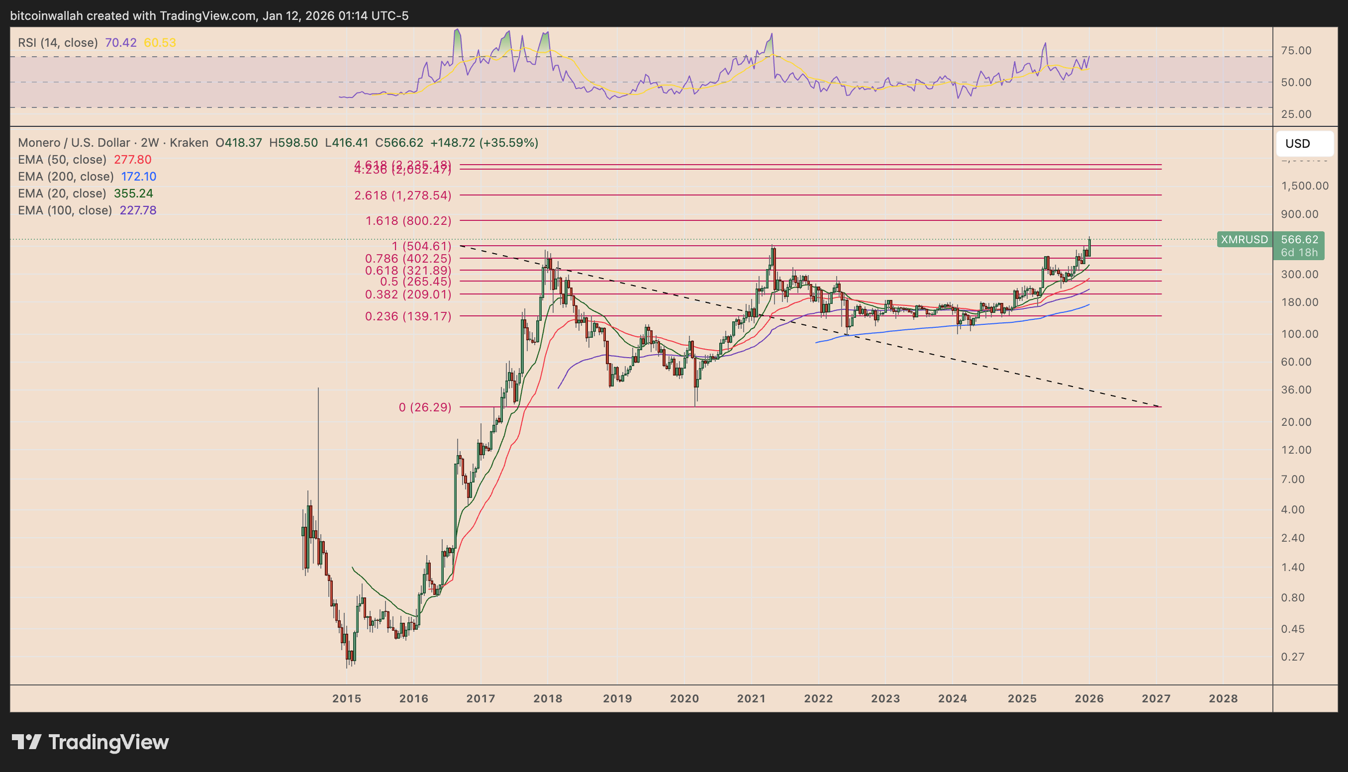 Da una prospettiva Fibonacci, il caso rialzista per il 2026 di XMR resta costruttivo anche in uno scenario più conservativo.