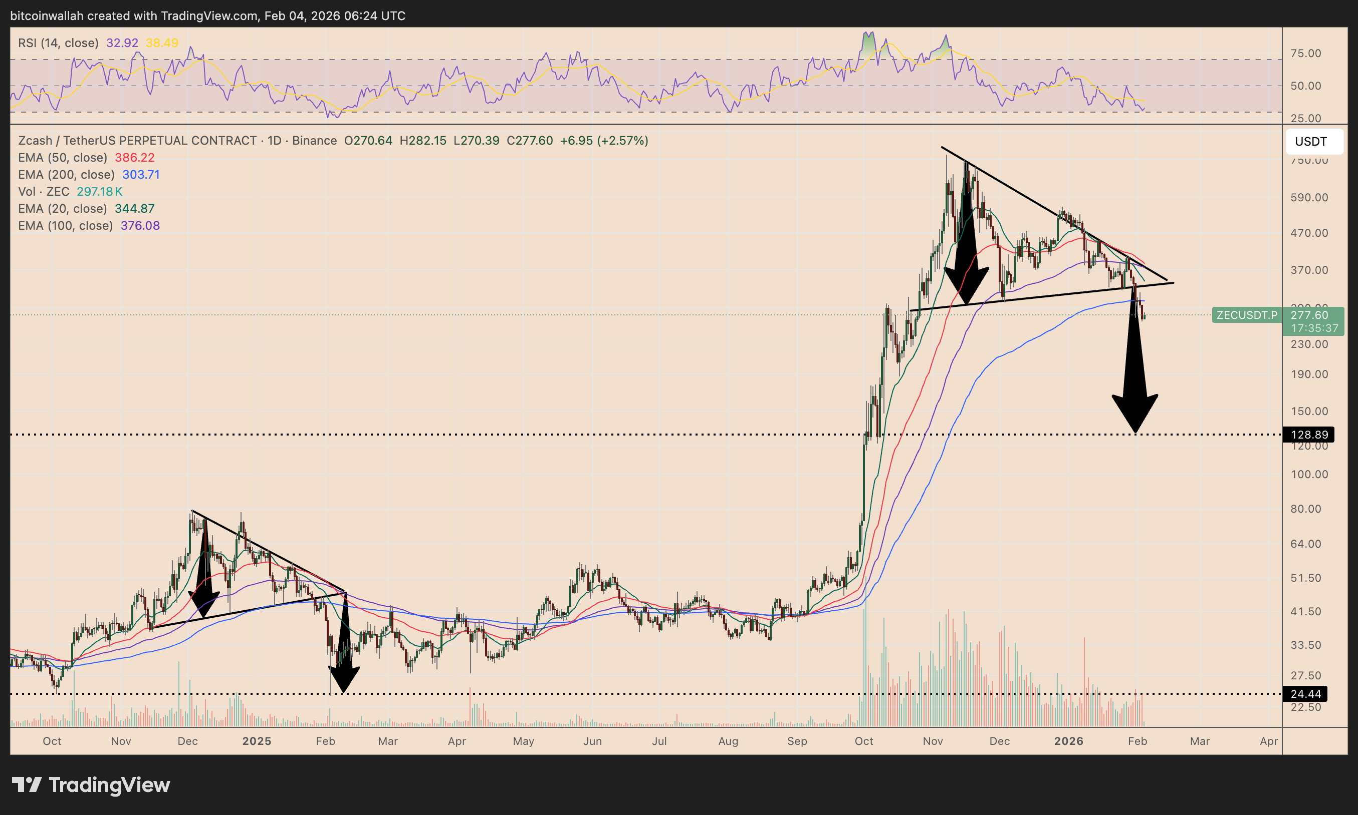 Da un punto di vista tecnico, la formazione si conclude quando il prezzo di Zcash rompe la trendline inferiore del triangolo e scende di un ammontare pari all’altezza della precedente tendenza al ribasso.