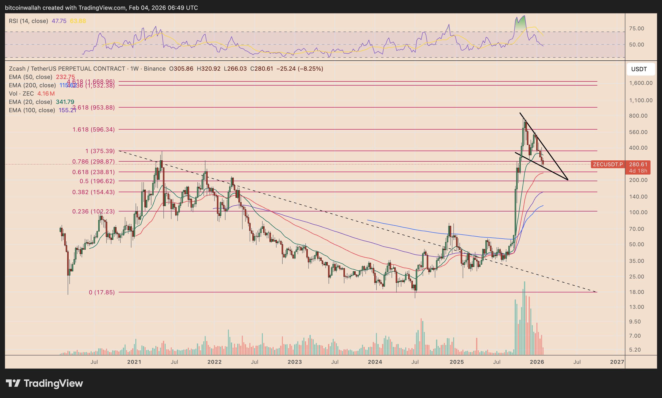 Se il prezzo di ZEC dovesse rompere il supporto del cuneo, la pressione di vendita potrebbe accelerare. In tal caso, il prezzo di Zcash rischia di scivolare verso la media mobile esponenziale a 100 settimane e il livello di Fibonacci 0,382 vicino a $155, dove gli acquirenti a più lungo termine potrebbero tentare di intervenire.