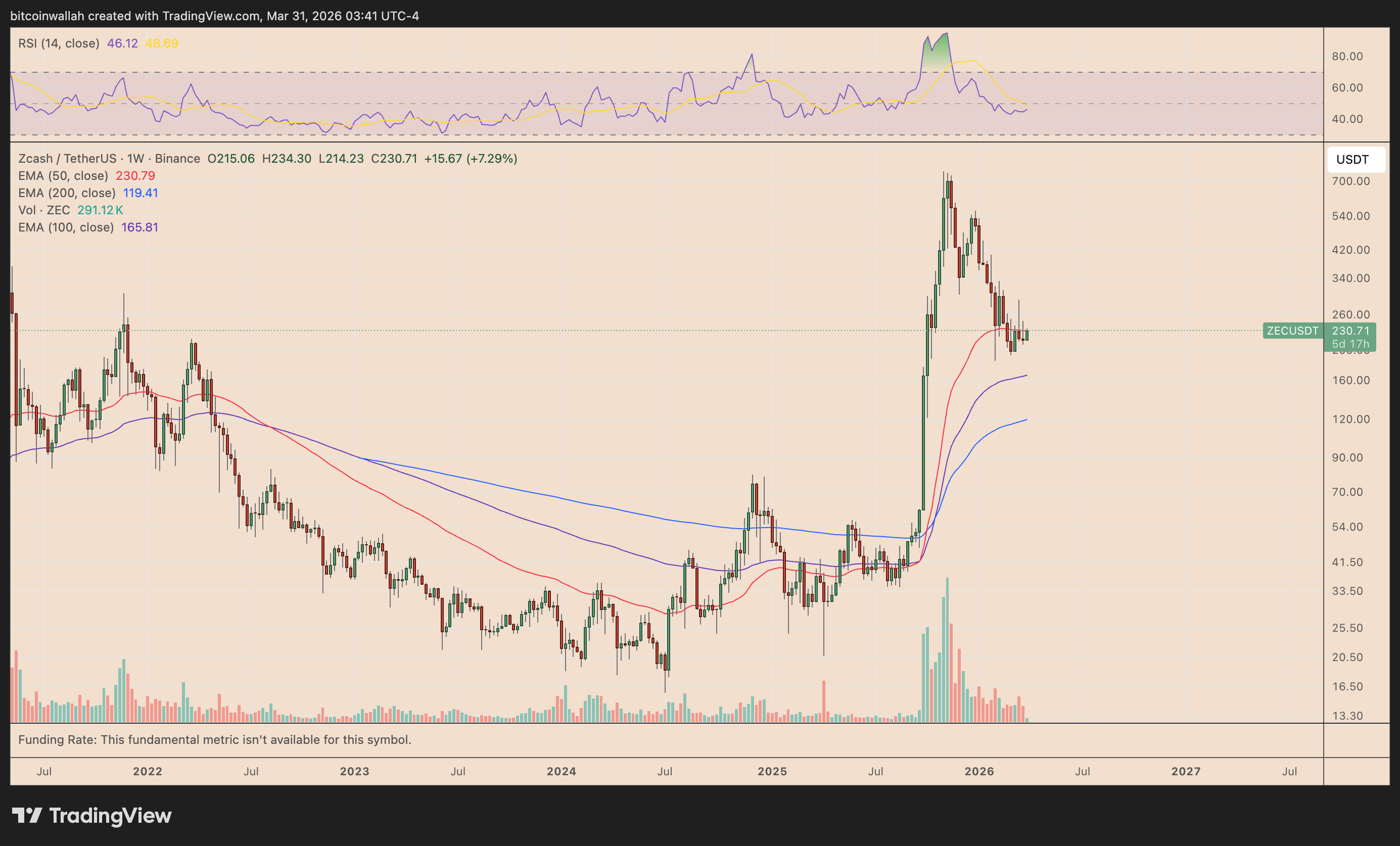 Nel caso di ZEC, il prossimo supporto importante si trova sulla EMA a 100 settimane, mostrata dall’onda viola vicino ai $166. Un calo verso quel livello equivarrebbe a una perdita di circa il 30% dai prezzi correnti.