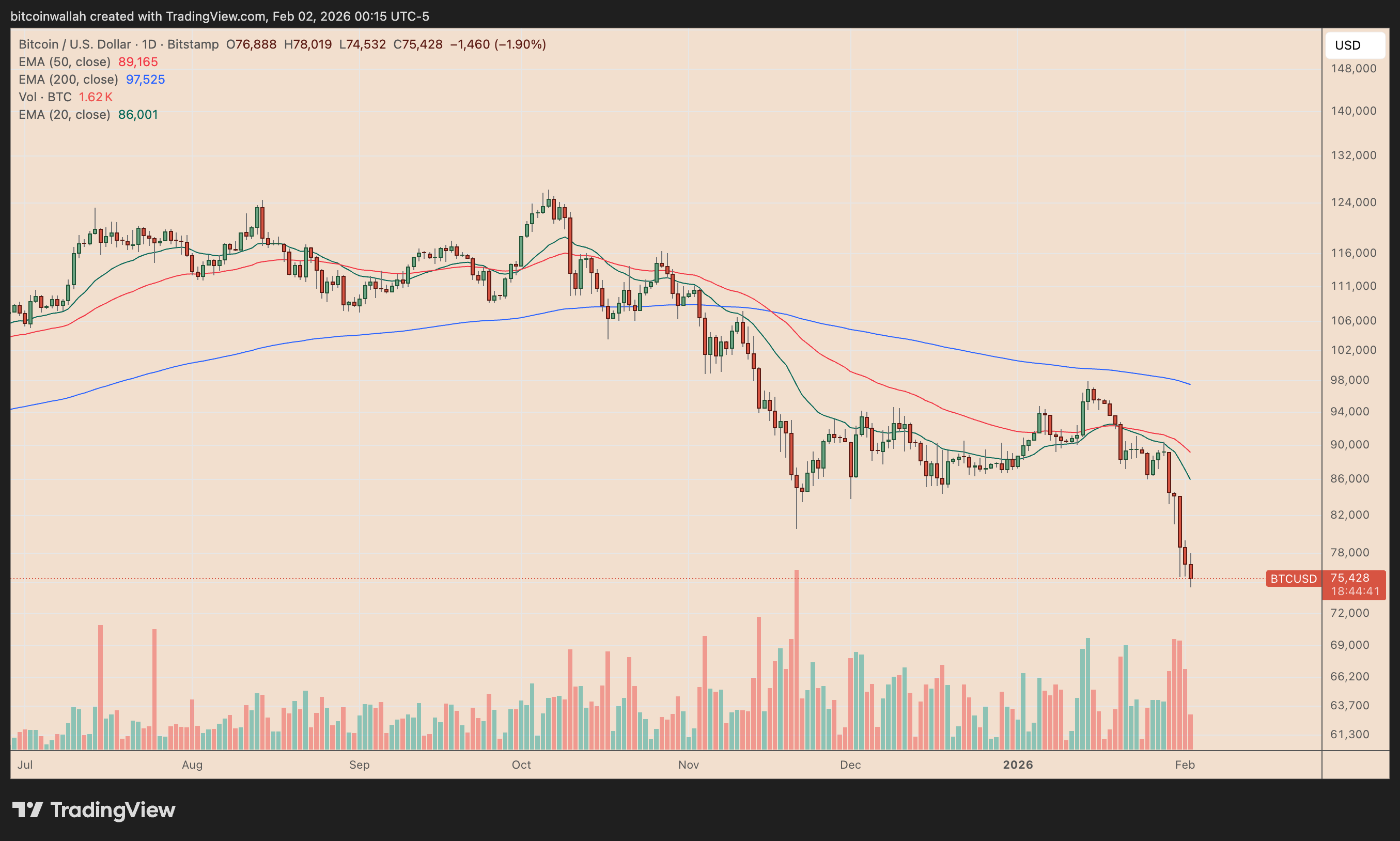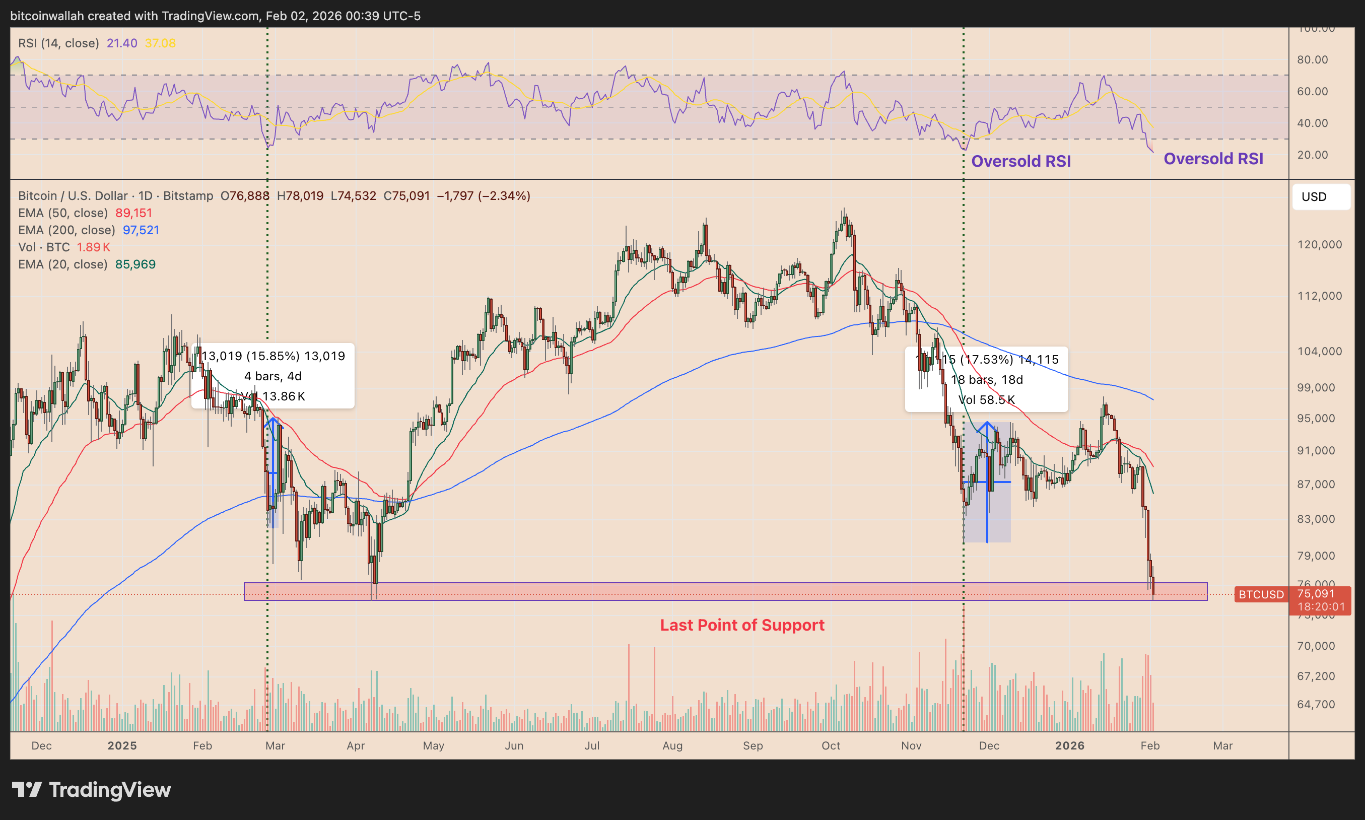 Bitcoin sta testando la sua ultima zona di supporto tra $74.500 e $76.500, un intervallo che ha funzionato come forte area di domanda nell’aprile 2025, precedendo un movimento al rialzo di circa il 70%.
