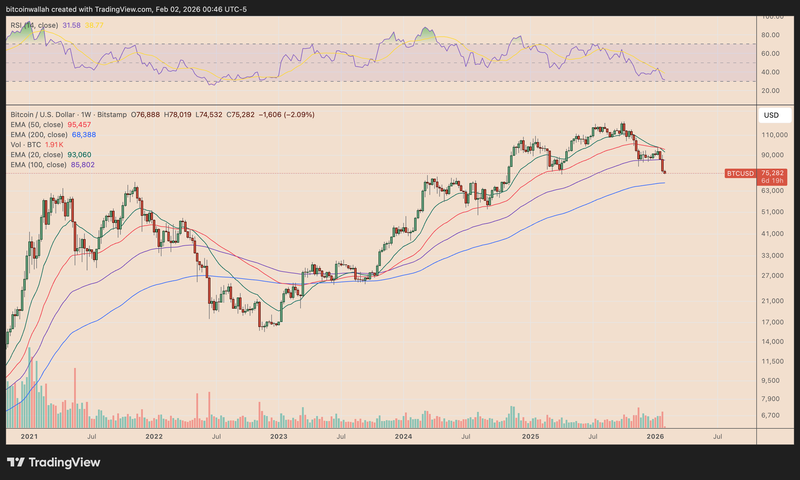 La mia visione settimanale su Bitcoin resta fortemente ribassista. Vedo Bitcoin ripetere la sua struttura ciclica quadriennale, il che potrebbe portare il prezzo ulteriormente verso la sua EMA a 200 settimane (la linea blu) intorno ai $68.000.