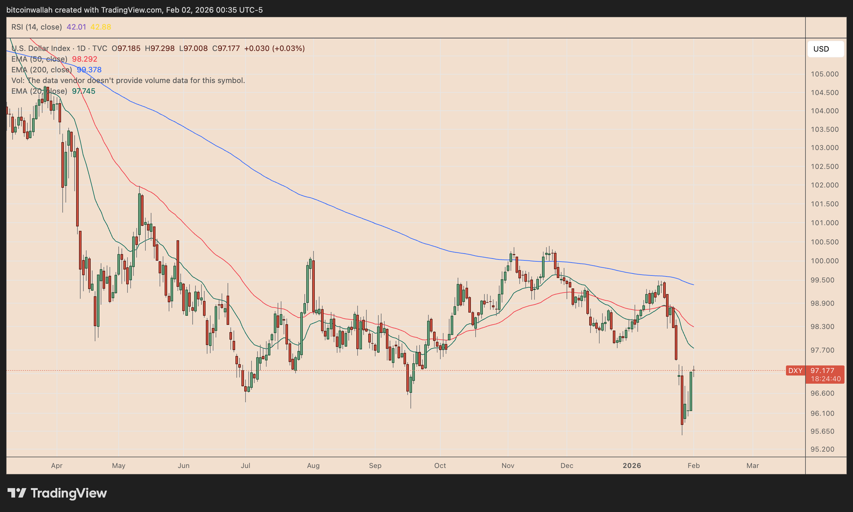 Tecnicamente tenterà di avvicinarsi alla EMA a 20 giorni (la linea verde) a circa 97,44 più avanti in settimana.