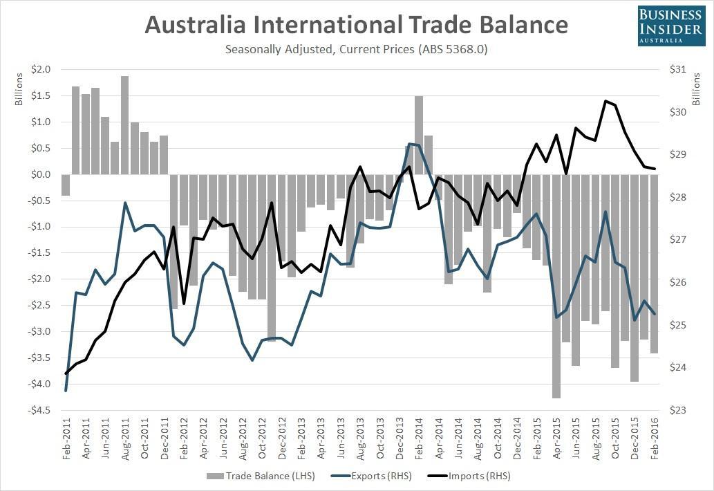 Tuttavia, secondo i dati pubblicati dall’Ufficio di Statistica australiano, nello stesso periodo, le licenze edilizie hanno registrato un incremento di un buon 3,1%, rimbalzando dalla contrazione del 7,5% del mese precedente e superando le previsioni che davano l’aumento al 2,5%. A febbraio, il disavanzo commerciale dell’Australia è drammaticamente balzato a 3,4 miliardi di dollari, la quinta lettura per grandezza da quando l’Ufficio di Statistica australiano ha iniziato a registrare tale dato 45 anni fa.