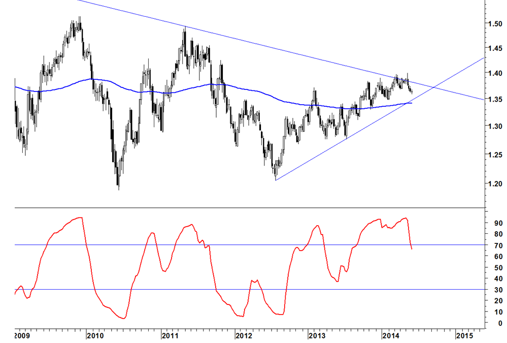 Tecnicamente un oscillatore come il Relative Momentum Index su scala weekly sembra in effetti propendere per una soluzione bearish nei prossimi mesi, almeno stando al comportamento passato del cambio in occasione di ipercomprati così definiti. E’ abbastanza evidente comunque che l’area critica di supporto ed al di sotto della quale si parlerebbe di inversione di tendenza è 1.3450, perciò…parola a Draghi.