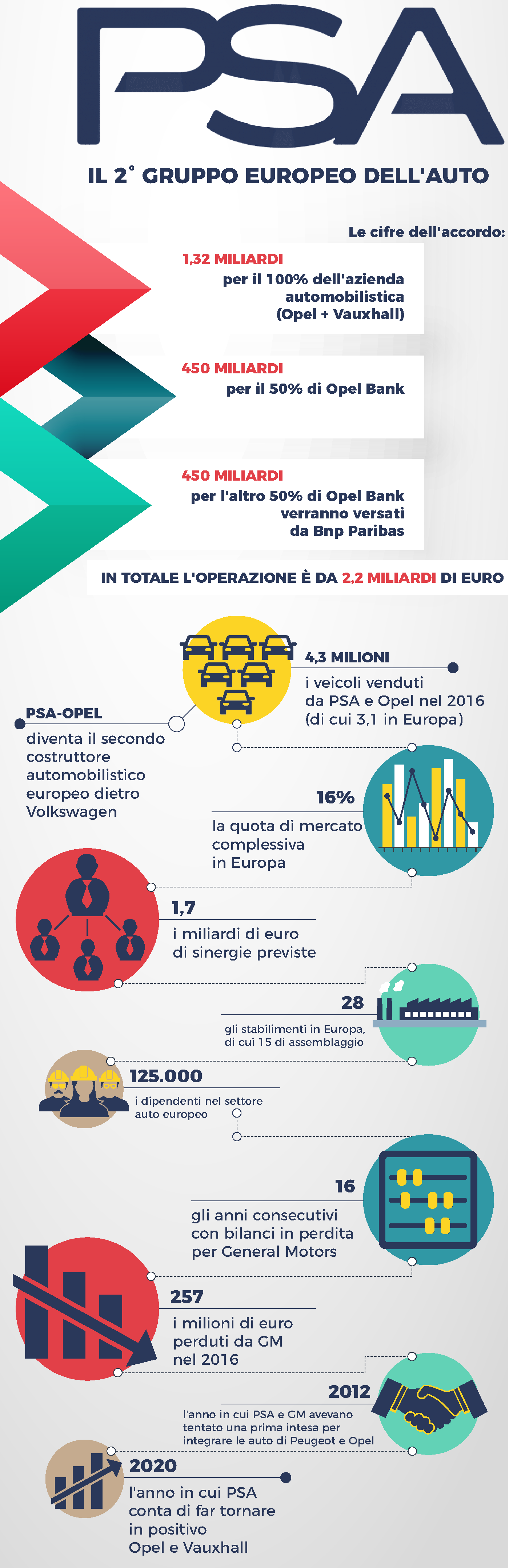La fusione tra la francese Psa (il gruppo di Peugeot e Citroen) e Opel – Vauxhall, il marchio tedesco da anni in mano agli americani di General Motors, va a generare il secondo gruppo automobilistico d’Europa. Stiamo parlando di un’operazione che, nel complesso, muove oltre due miliardi di euro e centinaia di migliaia di dipendenti dislocati in quasi trenta stabilimenti che sorgono in diverse parti del Vecchio Continente. Ma che cosa comporta questa tanto chiacchierata acquisizione? E cosa significa, al di là delle semplici cifre, assemblare due colossi del ramo automobilistico? Lo spiega l’infografica realizzata dai grafici di Stampaprint, azienda leader europeo del web to print.