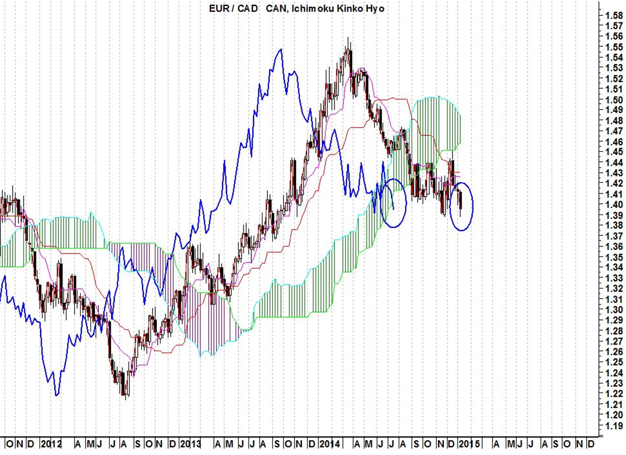 EurCad sembra aver rotto al ribasso degli importanti livelli di supporto sia a livelli giornaliero che settimanale. Finora il merito di questa discesa è tutto di EurUsd (UsdCad è infatti forte e sopra 1,18), ma è chiaro che una fase di tensione sull’Euro legata alla percezione dei mercati di una fragilità politica dell’Eurozona potrebbe restituire smalto anche alla valuta oceanica che a quel punto avrebbe aperte le porte di 1.35. Il segnale che deriva sulle Ichimoku cloud settimanali in chiusura sembra confortare una view bearish. A questo punto chi gioca sulle rotture ribassiste dei supporti qui dovrebbe azzardare lo short EurCad.