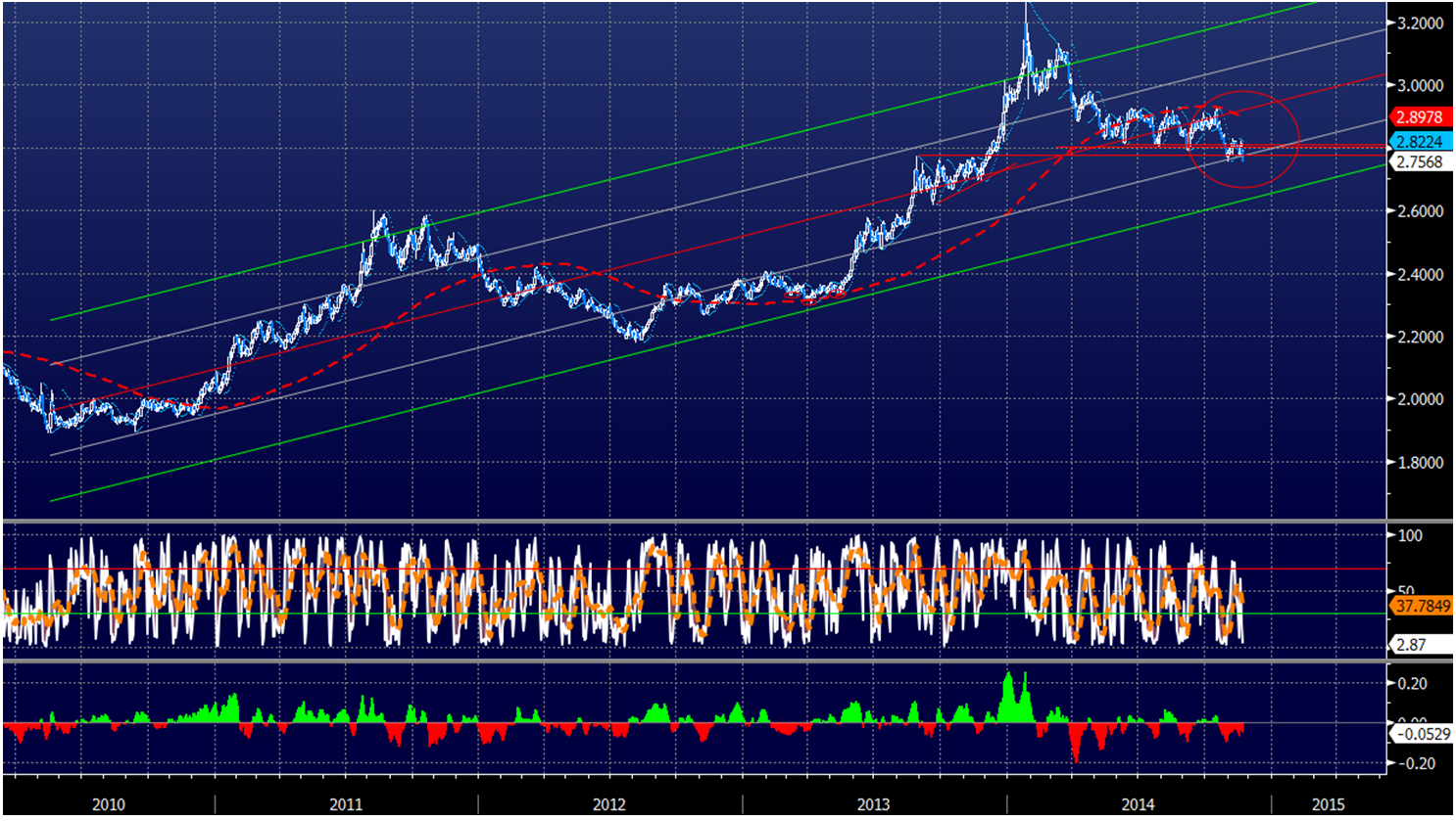 Rompe gli indugi il cambio EurTry con le notizie provenienti dalla Bce. Il range 2.80/2.90 ha trovato la sua via d’uscita nella parte bassa creando a questo punto la concreta possibilità di vedere una discesa del cross verso area 2.60/2.62, un rally che non inficerebbe il bull market di EurTry di lungo periodo, ma che contribuirebbe a normalizzare gli eccessi accumulati nel mese di gennaio 2014. A 2.60 si trova il massimo del 2011 ed è prevedile che oltre non si andrà, ma considerando i ricchi interessi offerti dai bond turchi il trade short si può tentare.