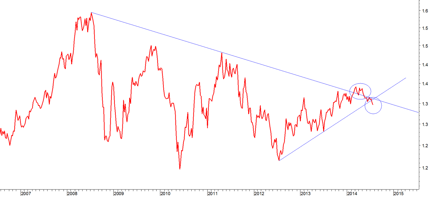 Il tentativo fallito di aprile di sfondare verso l’alto la trend line ribassista si sta risolvendo al contrario con un contro break, stavolta verso il basso. Sotto 1.34 non ci sarebbero dubbi e lo spostamento del cambio verso 1.28/1.30 crediamo sarebbe a quel punto inevitabile.