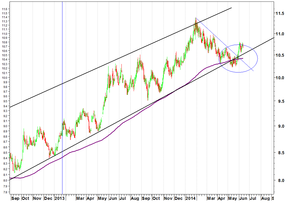 Il grafico ci mostra una rottura tecnica che a questo punto potrebbe anche avere risvolti di medio periodo importanti; come si vede chiaramente tutto il bull market partito nel 2007 è a questo punto messo in discussione rendendo la Sterlina una valuta su cui puntare per il resto dell’anno. Nella settimana entrante il 17 giugno in UK verranno pubblicati i dati di inflazione e prezzi alla produzione, numeri che potrebbero mettere ancora maggior pressione sulla forza del Pound.