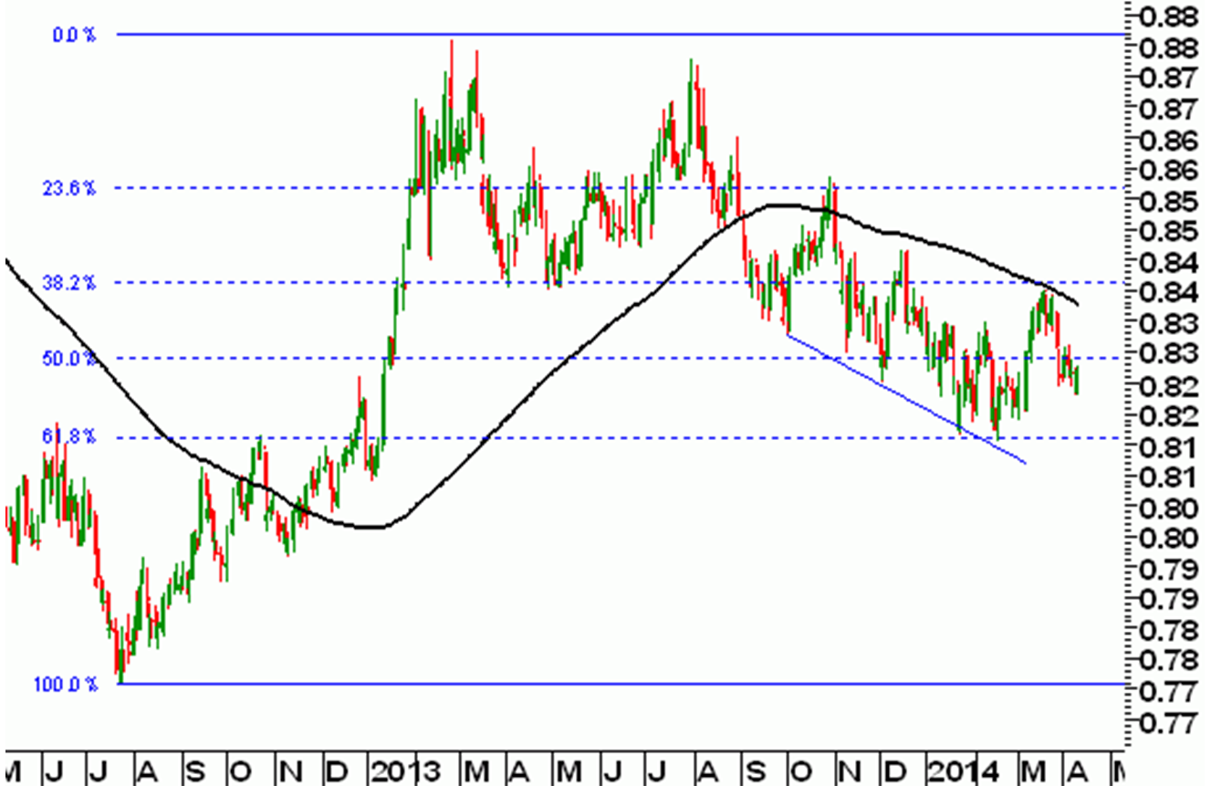 Evidente come tecnicamente vicina ad un punto di svolta la situazione di EurGbp. I ripetuti test della media mobile a 200 giorni del mese di marzo si sono risolti con una netta risposta del mercato spingendo il cross vicino a 0.82, ma la vera barriera da superare per invertire la tendenza è quel 0.816 che rappresenta anche il 61.8% di ritracciamento dell’intero rialzo 2012-2013.